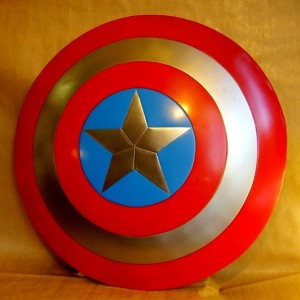 Captain America Schild, ganz aus Eisen, handgefertigt, mit zwei Riemen an der Rückseite für den Schulter gemacht. Schild leicht konkav, kuppelförmige,..